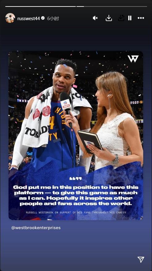 此图出自掘金对阵快船G7赛后,当时威斯布鲁克接受采访时表示:“我能在这里打球是一种恩赐,我现在还能在每场比赛中登场、从事我喜爱的篮球运动。我在中国的球迷朋友们,感谢你们、太爱你们了。我想见你们了,多保重哈!”
